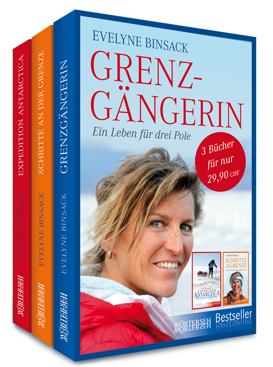 Zum Siebzig-Jahr-Jubiläum der Erstbesteigung des Mount Everest bieten wir die drei Bücher von Evelyne Binsack als 3er-Bundle an. In ihrem ersten Buch »Schritte an der Grenze« erzählt die Extremsportlerin, die am 23. Mai 2001 als erste Schweizerin auf dem höchsten Gipfel unserer Erde stand, wie sie sich auf dieses grosse Abenteuer vorbereitete, wie sie die Anstrengung meisterte und wie ein Fläschchen Weihwasser in der Todeszone ihr Leben rettete. In »Expedition Antarctica« macht sie klar, was es heisst, aus eigener Muskelkraft den südlichsten Pol unserer Erde zu erreichen. Von ihrem Zuhause im Berner Oberland bis zum Südpol war sie 484 Tage lang unterwegs, die meiste Zeit allein. Am 29. Dezember 2007 war sie am Ende ihrer Kräfte und endlich am Ziel. Zehn Jahre später, nämlich am 12. April 2017, erfüllte sich, wovon die diplomierte Bergführerin schon immer geträumt hatte – alle drei Pole zu erreichen. Diese dritte Reise, die sie an den Nordpol führte, beschreibt sie in ihrem bis anhin letzten Buch »Grenzgängerin«.